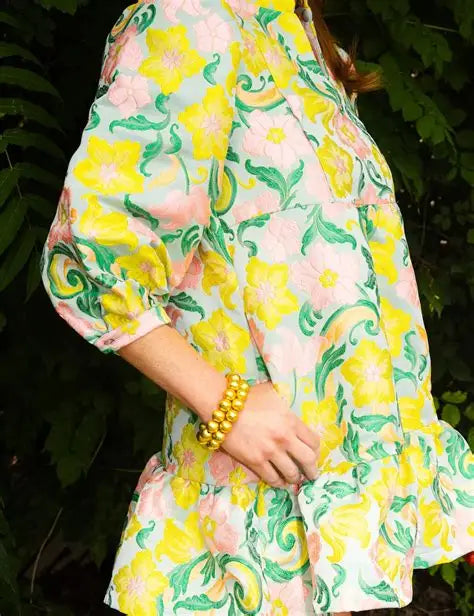 Step into the spotlight with the radiant charm of our Neon Paradise Bib Dress. Crafted from a luxe metallic jacquard, this mini silhouette shimmers with every move—making it the ultimate statement piece for your next celebration. Featuring puff sleeves, a ruffled hem, and an elegant bib-front detail, it’s equal parts bold and beautiful.
