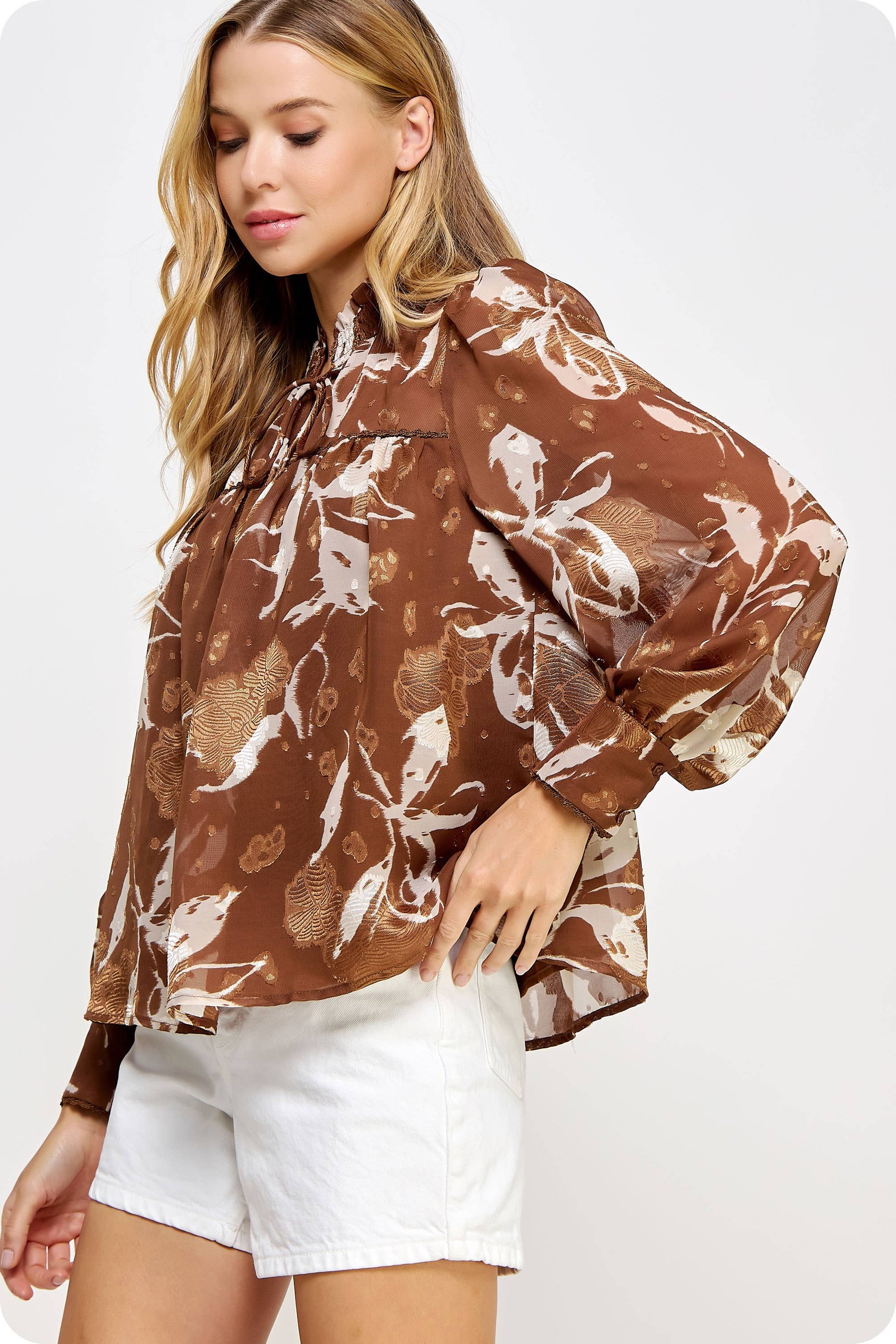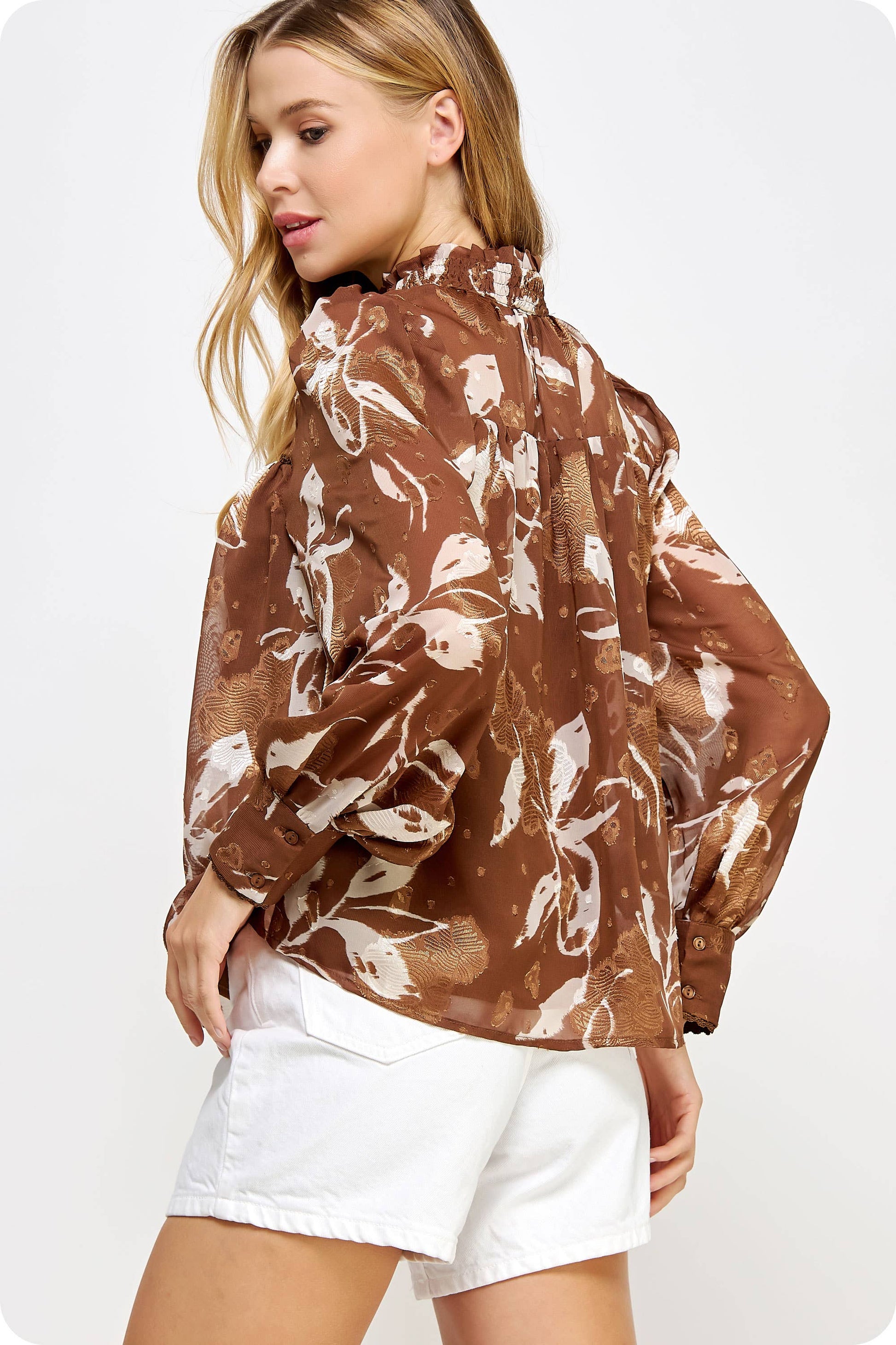 Contrast scalloped trim blouse in floral print on yoryu jacquard chiffon fabric. This top features scalloped lace trim at yoke/cuff, long sleeves with button cuff, partial bodice lining, split V neck with tie detail, and ruffle mock neck.