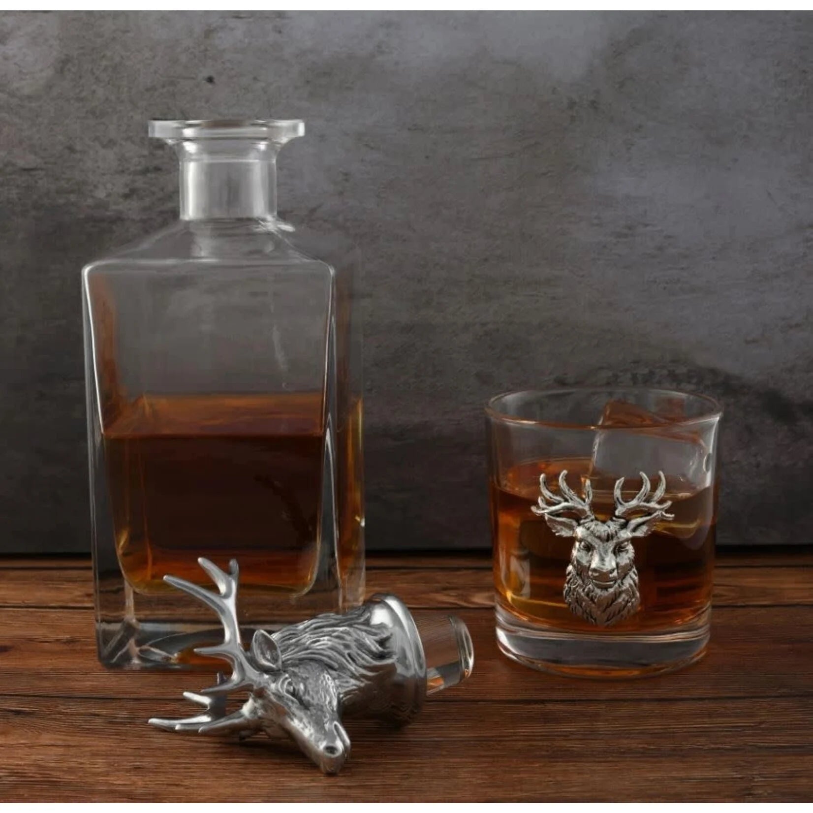 Elevate any home bar with this stunning Elk / Deer Bust Decanter Set, a thoughtful combination of artistry and function. Featuring a 750 ml glass decanter topped with a detailed 3D elk (or deer) head bust stopper, and paired with two matching 10 oz glasses—each adorned with a coordinating metal elk-head accent—this set blends wilderness charm with elegant design.