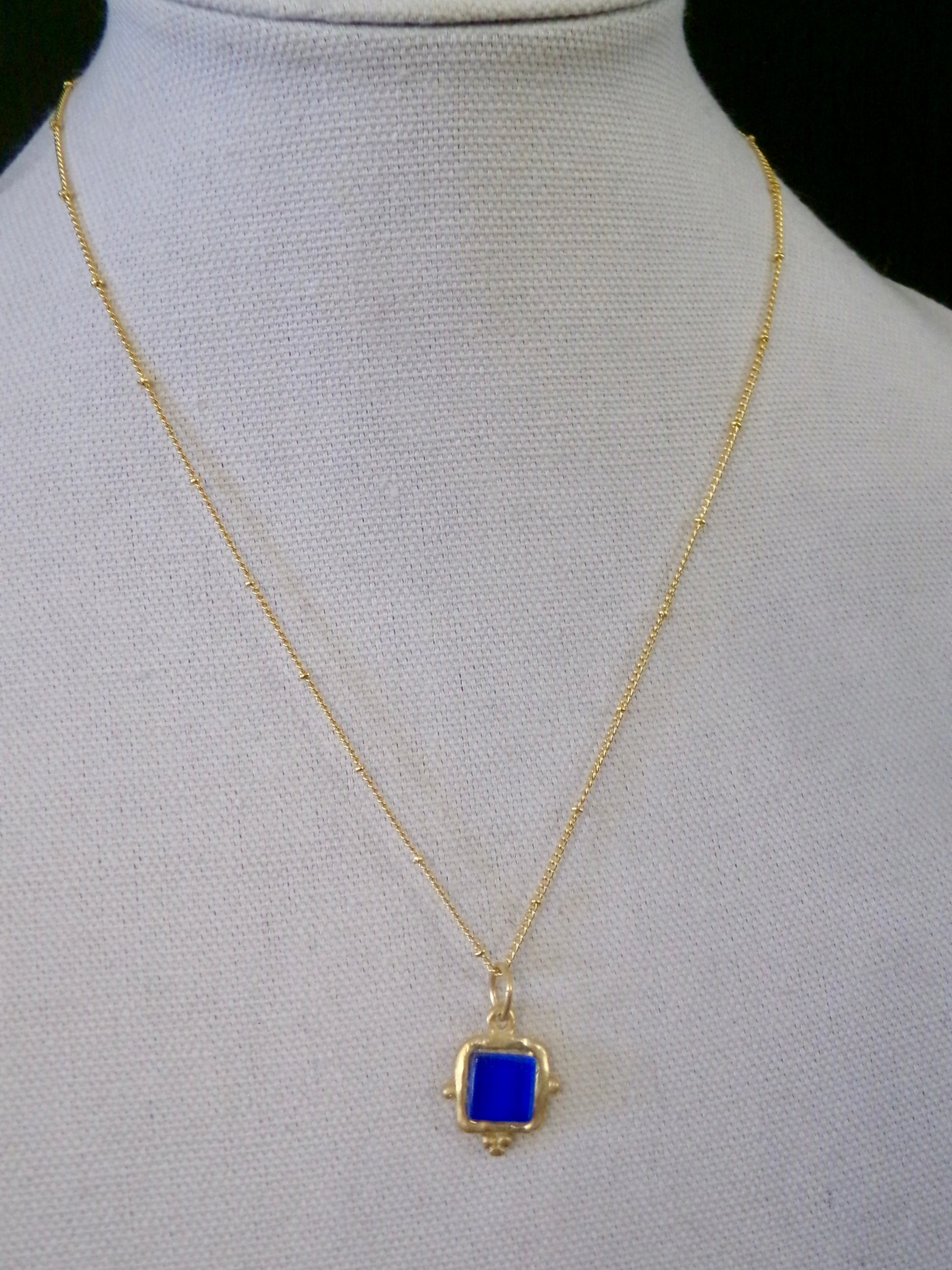 Chic, artisan-crafted, and full of character, our Handcast Gold Square with Blue French Glass Necklace is a modern take on classic elegance. The handcast gold square pendant showcases a vibrant blue French glass inset, capturing light beautifully and adding a touch of sophistication to any outfit.