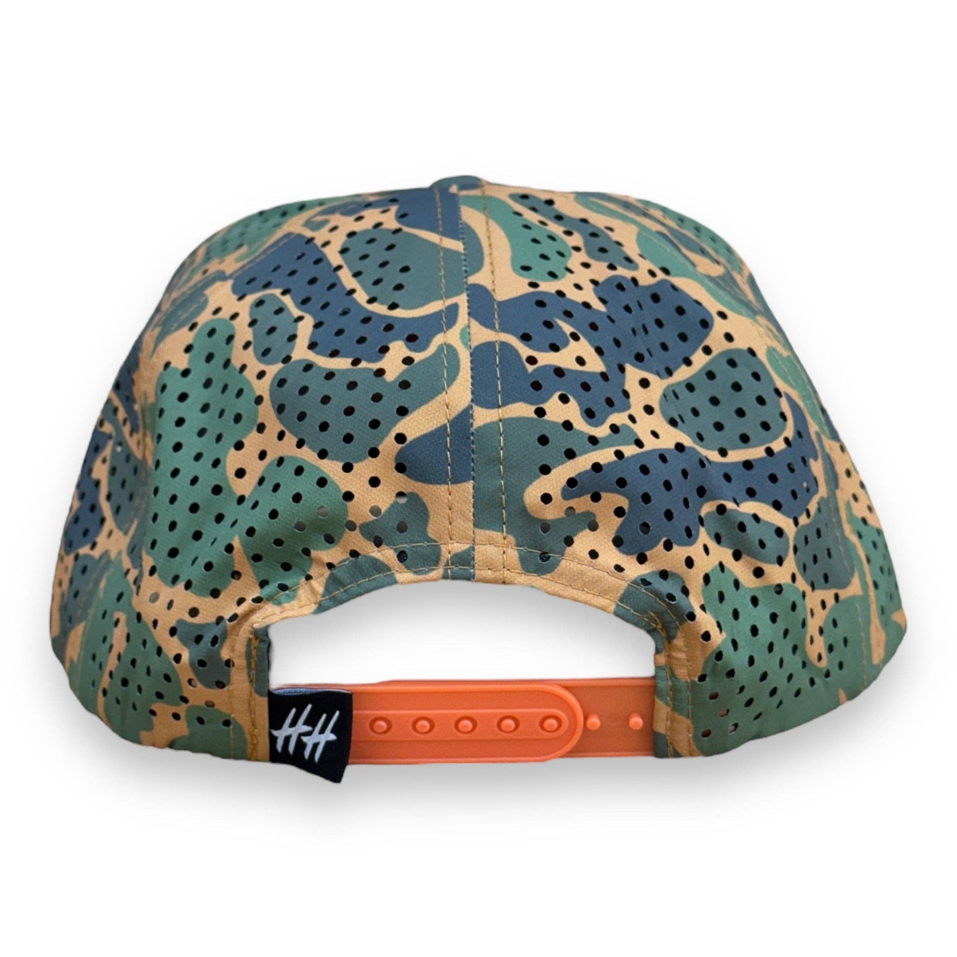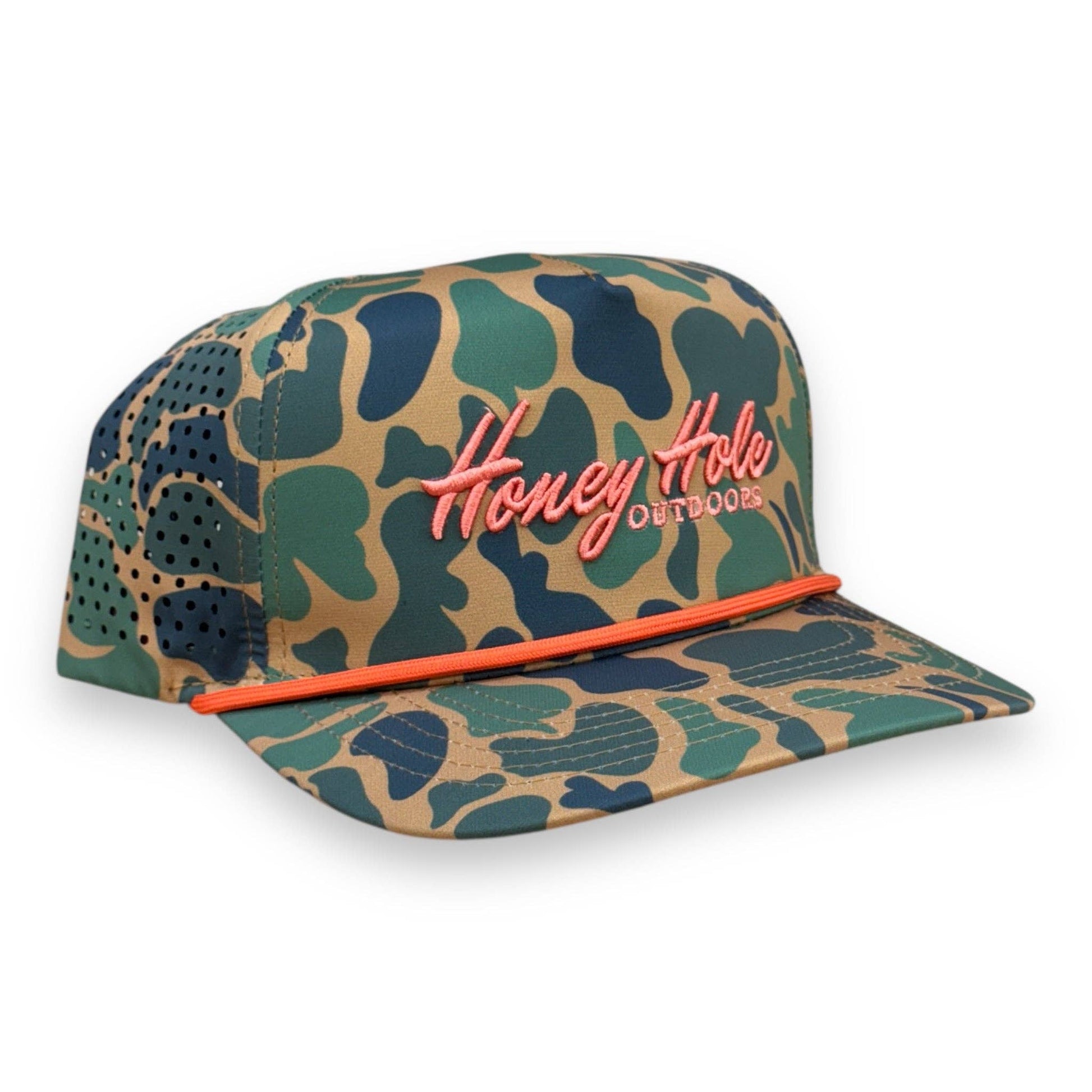 We’ve brought the classic rope hat into the new age with precision laser mesh detailing and performance-driven comfort. Featuring our bold green duck camo design with striking blaze orange accents, this hat blends timeless outdoor style with modern innovation.