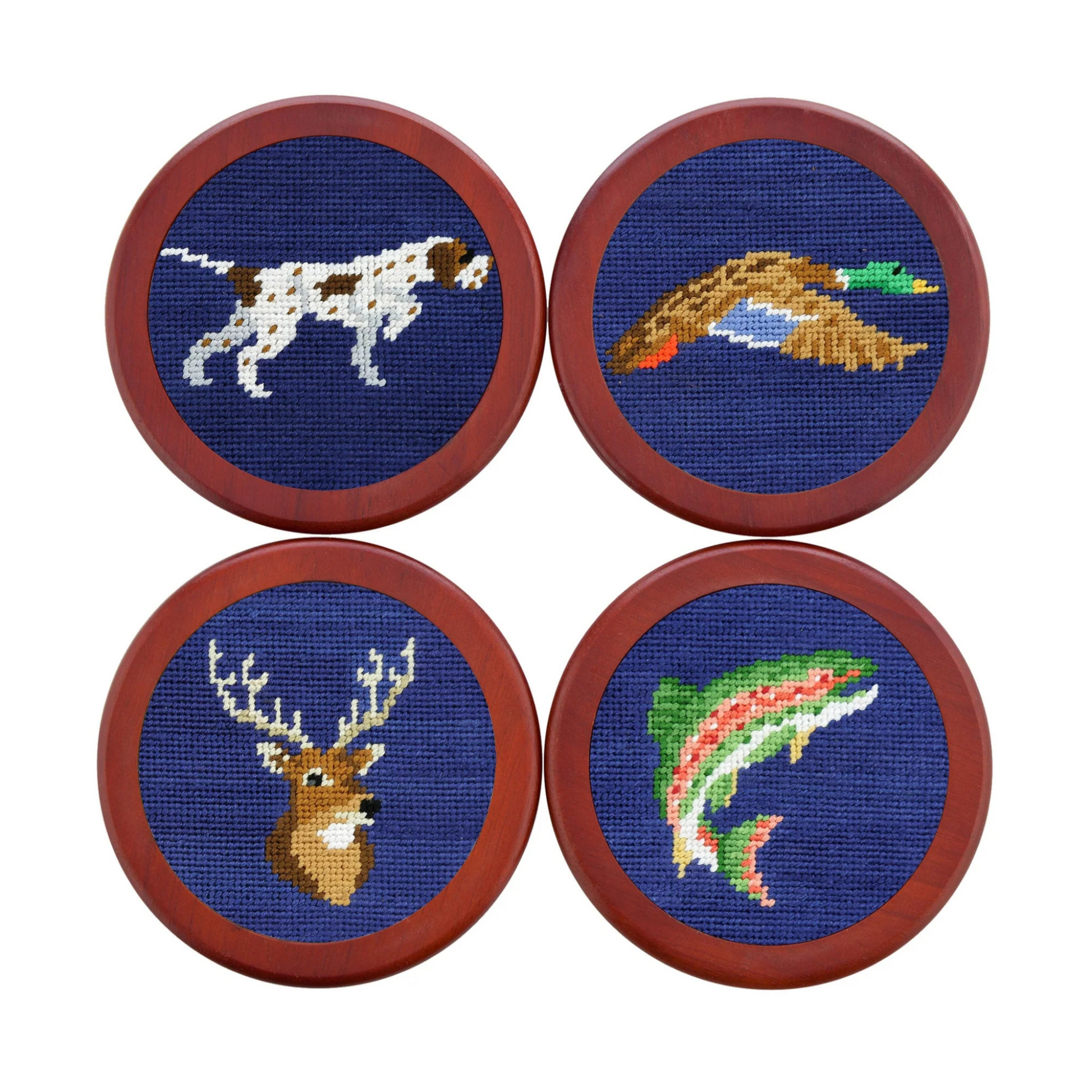 Elevate your home bar or outdoor lounge with these rugged yet refined needlepoint coasters. Each coaster showcases classic Southern sportsman imagery—think shotgun shells, pheasant feathers, and fishing flies—hand‑stitched in richly colored French cotton and mounted on warm, chestnut‑finished wood. This set of four arrives in a matching wooden holder, blending functional durability with elegant charm. Perfect for hunting cabins, river retreats, or any space where timeless outdoor style meets everyday practicality.