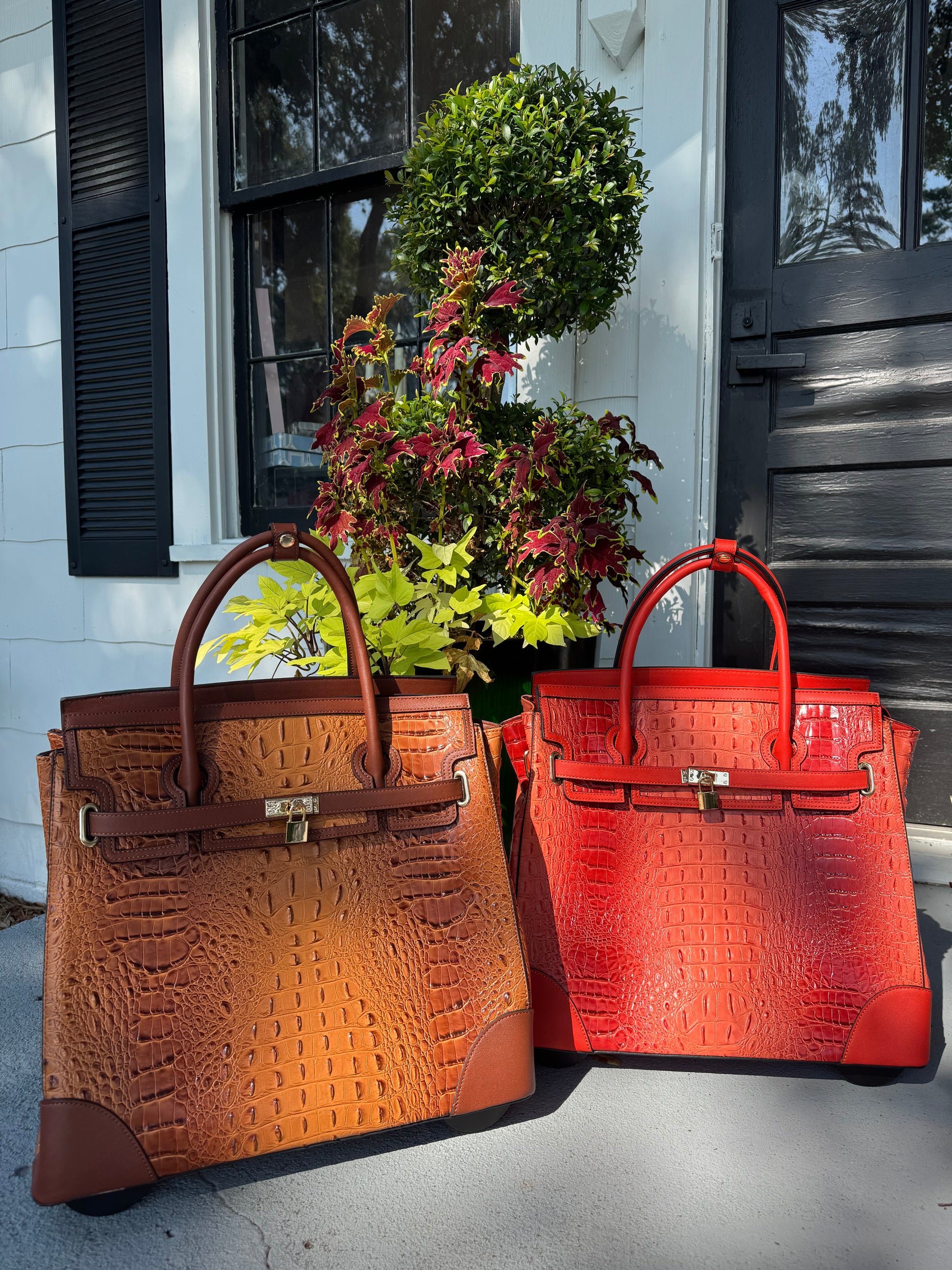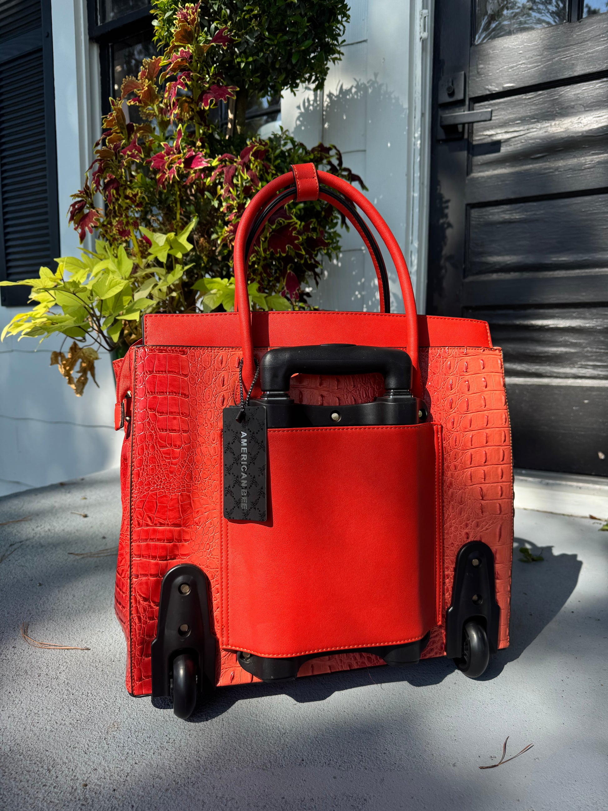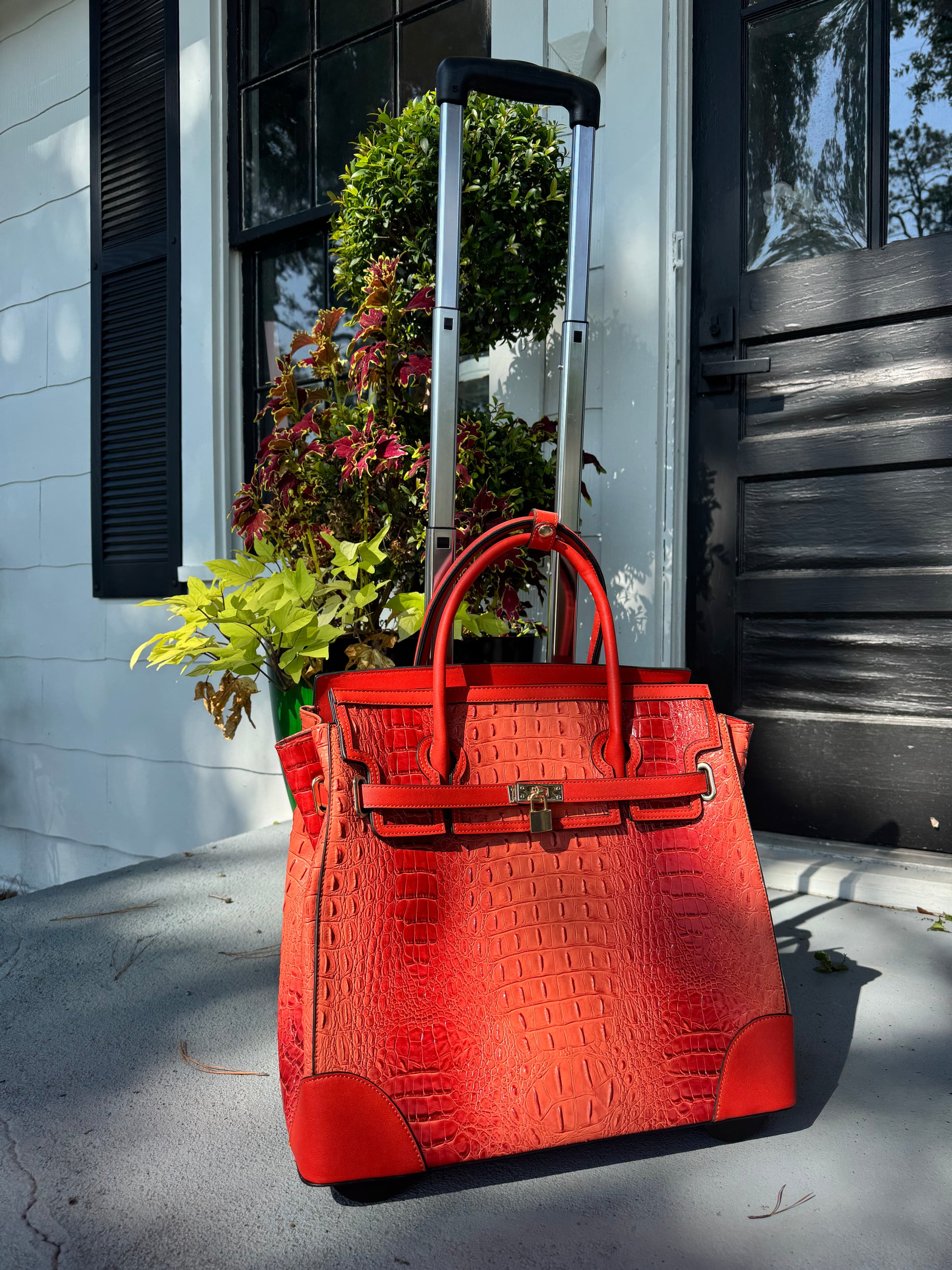 Where timeless charm meets modern travel. The Savannah Jetsetter is a rolling tote designed for the woman who carries a bit of Southern grace wherever she goes. With its rich brown hue or Coral, and classic, structured silhouette, this beauty calls to mind vintage train cases and well-worn leather trunks—reimagined for today’s journeys.
